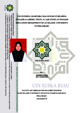 KHOIRUNNISA, - (2025) UNCOVERING LEARNERS CHALLENGES IN READING ENGLISH ACADEMIC TEXTS: A CASE STUDY AT ENGLISH EDUCATION DEPARTMENT OF AN ISLAMIC UNIVERSITY IN PEKANBARU. Skripsi thesis, UNIVERSITAS ISLAM NEGERI SULTAN SYARIF KASIM RIAU.