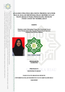 ABSTRAK Dini Rahayu (2025): Analisis Strategi Branding Produk Kuliner Halal Dalam Meningkatkan Kepercayaan Masyarakat Pada Pengusaha Muslim Food Court di Tembilahan Penelitian ini dilatarbelakangi oleh usaha tempat makan yaitu Pengusaha Muslim Food Court Tembilahan yang beralamat di Jl. Baharuddin Yusuf, Sei. Beringin, Kota Tembilahan. Semakin meningkatnya kesadaran konsumen, baik Muslim maupun non-Muslim, terhadap pentingnya memilih makanan yang tidak hanya enak tetapi juga bersih, aman, dan memiliki jaminan kehalalan. Hal ini mendorong perlunya strategi branding yang efektif dalam membentuk kepercayaan konsumen. Maka permasalahan dalam penelitian ini yaitu: (1) Bagaimana strategi branding produk kuliner halal dalam meningkatkan kepercayaan konsumen pada pengusaha muslim food court di Tembilahan?. (2). Apa saja faktor pendukung dan penghambat yag dihadapi pengusaha muslim food court dalam menerapkan strategi branding?. Tujuan dari penelitian ini yaitu untuk menganalisis strategi branding produk kuliner halal dalam meningkatkan kepercayaan konsumen pada pengusaha muslim Food Court di Tembilahan. Metode penelitian yaitu penelitian lapangan (field research). Untuk mengetahui jawaban dari rumusan masalah di atas, Penulis mengambil Lokasi penelitian di Pengusaha Muslim Food Court kota Tembilahan, dengan jumlah informan sebanyak 10 orang yang terdiri dari 1 pemilik usaha, 3 karyawan dan 6 konsumen di Pengusaha Muslim Food Court Tembilahan. Sumber data yang digunakan adalah data primer melalui wawancara, observasi, studi pustaka dan dokumentasi. Sedangkan metode analisa data yang dipergunakan adalah metode analisa deskriptif kualitatif. Hasil penelitian menunjukkan bahwa strategi branding yang diterapkan oleh Pengusaha Muslim Food Court berhasil membangun identitas brand yang kuat melalui (Brand Positioning, Brand Personality, Brand Identity, dan Brand Trust) dengan penamaan tempat, visual islami, pelayanan ramah, serta jaminan kehalalan produk. Strategi ini meningkatkan kepercayaan konsumen, baik Muslim maupun non-Muslim. Faktor pendukung antara lain: citra religius dan kejujuran pemilik usaha, sertifikaat halal yang terpajang jelas, konsistensi branding dalam pelayanan, makanan yang disajikan benar-benar halal, mendukung bisnis kuliner lain dan target pasar food court pengusaha muslim semua kalangan. Adapun faktor penghambat yang ditemukan meliputi: susah merekrut karyawan yang sesuai dengan citra brand islami dan kurangnya inovasi menu atau konsep. Kata Kunci: Strategi Branding, Kuliner halal, Kepercayaan Konsumen, Food Court.