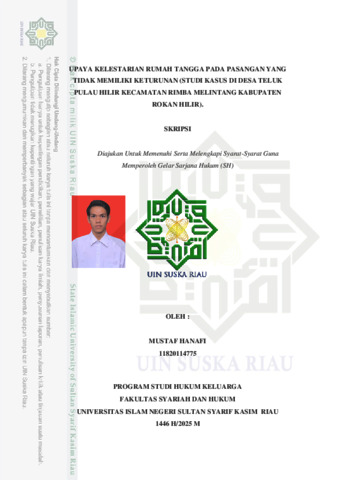 ABSTRAK Mustaf Hanafi (2024): Upaya Kelestarian Rumah Tangga Pada Pasangan yang Tidak Memiliki Keturunan (Studi Kasus di Desa Teluk Pulau Hilir Kecamatan Rimba Melintang kabupaten Rokan Hilir). Penelitian ini dilatarbelakangi oleh harmonisasi rumah tangga pada pasangan yang belum memiliki keturunan. Keturunan diartikan sebagai buah hati orang tua dan menjadi syarat terpenting dalam mengarungi kehidupan berumah tangga. Secara sosial kehidupan berumah tangga tanpa keturunan berdampak pada stigma negatif yang dialami setiap pasangan. Oleh karena itu, fokus penelitian ini pada konsep kelestarian rumah tangga dan upaya dalam mempertahankan kelestarian rumah tangga pada pasangan suami istri yang belum memiliki keturunan di Desa Teluk Pulau Hilir Kecamatan Rimba Melintang kabupaten Rokan Hilir. Penelitian lapangan ini termasuk penelitian hukum empiris, dkaji melalui pendekatan kualitatif deskriptif, yang dengan menggunakan teknik pengumpulan data observasi, wawancara dan dokumentasi serta teknik pengolahan data pengabsahan dan analisis. Hasil penelitian ini bahwa: (1) Konsep kelestarian rumah tangga pada pasangan suami istri yang tidak memiliki keturunan adalah rumah tangga berlandaskan agama, saling pengertian, adanya keturunan, komunikasi yang terjalin baik, adanya komitmen, hingga rasa tanggung jawab dalam menjalankan hak dan kewajiban rumah tangga. (2) Upaya yang dilakukan oleh kelima subjek yang tidak memiliki keturunan yaitu: Upaya internal seperti menjalankan kehidupan beragama, sikap optimis, bermusyawarah jika terjadi perselisihan serta memberikan rasa cinta dan sayang antara suami istri. Sedangkan upaya eksternal seperti terjalinya hubungan baik antara keluarga dan lingkungan, pengobatan medis dan non medis serta dengan mengangkat anak untuk dipelihara Kata Kunci : Kelestarian, Pasangan Suami Istri, Tidak memiliki keturunan