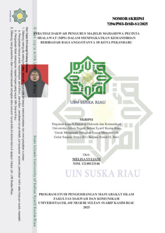 MELISA YULIANI, - (2025) STRATEGI DAKWAH PENGURUS MAJELIS MAHASISWA PECINTA SHALAWAT (MPS) DALAM MENINGKATKAN KEMANDIRIAN BERIBAD.AH BAGI ANGG.OTANYA DI K.OTA PEKANBARU. Skripsi thesis, UNIVERSITAS ISLAM NEGERI SULTAN SYARIF KASIM RIAU.