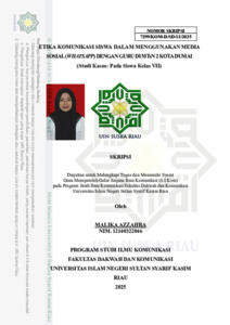 ABSTRAK Nama : Malika Azzahra Program Studi : Ilmu Komunikasi Judul : Etika Komunikasi Siswa Dalam Menggunakan Media Sosial (WhatsApp) Dengan Guru di MTsN 2 Kota Dumai (Studi Kasus: Pada Siswa Kelas VII) Penggunaan media sosial dalam dunia pendidikan semakin meluas, termasuk aplikasi WhatsApp sebagai sarana komunikasi antara siswa dan guru. Namun, fenomena ini memunculkan tantangan baru terkait etika komunikasi yang perlu diperhatikan oleh siswa dalam berinteraksi dengan guru. Penelitian ini bertujuan untuk mengeksplorasi bagaimana etika komunikasi siswa MTsN 2 Kota Dumai khususnya pada masing-masing ketua kelas dan sekretaris kelas VII saat menggunakan WhatsApp dalam konteks hubungan dengan guru. Penelitian ini menggunakan pendekatan kualitatif dengan desain studi deskriptif. Data dikumpulkan melalui wawancara, observasi dan dokumentasi terhadap siswa kelas VII yang menjadi informan. Hasil penelitian menunjukkan bahwa sebagian besar siswa telah menerapkan etika komunikasi yang baik, seperti memahami pentingnya kejujuran, penggunaan bahasa yang sopan, waktu pengiriman pesan yang tepat, menunjukkan penghargaan kepada guru, serta pentingnya memiliki empati dalam mengirimkan pesan. Penelitian ini memberikan wawasan tentang pentingnya memiliki etika komunikasi dalam menggunakan media sosial terutama dalam bertukar pesan dengan guru. Kata Kunci: Etika Komunikasi, Media Sosial, WhatsApp, Siswa, Guru.