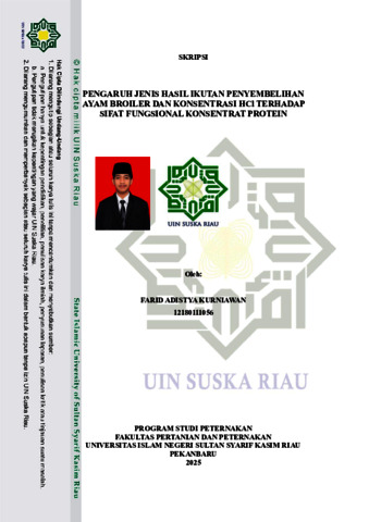 FARID ADISTYA KURNIAWAN, - (2025) PENGARUH JENIS HASIL IKUTAN PENYEMBELIHAN AYAM BROILER DAN KONSENTRASI HCl TERHADAP SIFAT FUNGSIONAL KONSENTRAT PROTEIN. Skripsi thesis, UNIVERSIITAS ISLAM NEGERI SULTAN SYARIF KASIM RIAU.