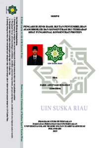 FARID ADISTYA KURNIAWAN(2025) :PENGARUH JENIS HASIL IKUTAN PENYEMBELIHAN AYAM BROILER DAN KONSENTRASI HCl TERHADAP SIFAT FUNGSIONAL KONSENTRAT PROTEIN Konsentrat protein memiliki kadar protein maksimum 65%. Konsentrat protein dibuat dengan cara menghilangkan komponen nonprotein seperti lemak, karbohidrat, mineral, dan air. Penelitian ini bertujuan untuk mengetahui kadar protein dan sifat fungsional konsentrat protein (daya emulsi, daya buih, daya mengikat air, dan daya serap minyak) yang dibuat dari hasil ikutan penyembelihan ternak ayam broiler (kepala, cakar, dan leher) dengan konsentrasi HCl yang berbeda. Metode penelitian menggunakan Rancangan Acak Lengkap (RAL) pola faktorial dengan 2 faktor dan 3 ulangan. Faktor A adalah jenis hasil ikutan penyembelihan ayam broiler (kepala, cakar, dan leher) dan faktor B adalah konsentrasi HCl (1 N, 1,5 N dan 2 N). Parameter yang diuji meliputi kadar protein, daya emulsi (kapasitas emulsi dan stabilitas emulsi), daya buih (kapasitas buih dan stabilitas buih), daya mengikat air, dan daya serap minyak. Data dianalisis secara statistis dengan analisis sidik ragam dan uji lanjut DMRT. Hasil penelitian menunjukkan terdapat interaksi antara jenis hasil ikutan ayam broiler (faktor A) dan peningkatan konsentrasi HCl memberikan pengaruh berbeda nyata terhadap nilai kadar protein, stabilitas emulsi, dan daya serap minyak dari konsentrat protein yang dihasilkan. Jenis hasil ikutan ayam broiler (Faktor A) kepala, cakar, dan leher dalam pembuatan konsentrat protein memberikan pengaruh nyata terhadap kadar protein, stabilitas emulsi, stabilitas buih dan daya serap minyak dari konsentrat protein yang dihasilkan. Peningkatan konsentrasi HCl (Faktor B) dalam pembuatan konsentrat protein memberikan pengaruh berbeda nyata terhadap kadar protein dari konsentrat protein yang dihasilkan. Faktor jenis hasil ikutan ayam broiler dan peningkatan konsentrasi HCl tidak berpengaruh nyata terhadap nilai kapasitas emulsi, kapasitas buih, stabilitas buih, dan daya mengikat air dari konsentrat protein yang dihasilkan. Perlakuan terbaik pada penelitian ini adalah A1B2 (jenis hasil ikutan ayam broiler kepala ayam, dengan konsentrasi HCl 1,5 N) ditinjau dari kadar protein, daya emulsi, daya mengikat air, dan daya serap minyak. Kata kunci: hasil ikutan penyembelihan, ayam broiler, konsentrat protein, konsentrasi HCl, sifat fungsional