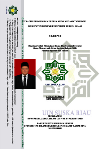 ABSTRAK Ahmad Farhan (2025): Tradisi Pernikahan Di Desa Kuok Kecamatan Kuok Kabupaten Kampar Perspektif Hukum Islam Penelitian ini dilatarbelakangi oleh adanya tradisi pernikahan di desa Kuok yang berbeda dengan desa lain. ini terdapat beberapa tahapan yang dilalui, tahapan tersebut dimulai dari menyuluh/merisik, bakampung menerima pinangan, meminang, bakampung bagholek, dan bagholek. Pada adat bagholek ini terdapat beberapa tahapan yang pertama pengucapan ijab dan qobul, berarak-arak, dan yang terakhir basiacung. Dari berbagai upacara adat di atas mengandung unsur anjuran dalam Islam untuk dilaksanakan dalam sebuah perkawinan bagi umat Muslim, hanya saja nama penyebutannya berbeda. Adapun permasalahan dalam penelitian ini adalah bagaimana praktik walimatul „urs di desa Kuok kecamatan Kuok kabupaten Kampar?, dan apa faktor-faktor yang mempengaruhi praktik walimatul „urs di desa Kuok kecamatan Kuok kabupaten Kampar? Serta bagaimana perspektif hukum Islam terhadap praktik walimatul „ursy di desa Kuok kecamatan Kuok kabupaten Kampar? Penelitian ini menggunakan metode penelitian deskriptif dengan menggunakan pendekatan analisis deskriftif kualitatif. Lokasi penelitian ini berada di desa Kuok kecamatan Kuok kabupaten Kampar. Sumber data yang digunakan adalah data primer berupa hasil observasi dan wawancara dilapangan yakni 1 orang budayawan di Desa Kuok, 2 orang kepala suku, 1 orang tokoh masayarat, 1orang cadiok pandai, 1 orang tertua di Desa Kuok, 2 orang masyarakat desa Kuok. Data sekunder berupa jurnal hukum, artikel hukum yang berkaitan dengan tema. Informan dalam penelitian ini berjumlah delapan informan, selanjutnya data diolah dan dianalisis secara deskriptif kualitatif, sehingga menghasilkan penelitian ilmiah yang dapat dipertanggung jawabkan. Dari hasil penelitian menjelaskan bahwasanya praktik walimatul „urs di Desa Kuok masih berjalan seperti biasanya. Praktek walimatul „urs di Desa Kuok ini sudah sesuai dengan ajaran Islam. Hanya berbeda pada penyebutannya saja. Dari tradisi walimatul „urs di Desa Kuok selama ini, masih ada yang menyalahi aturan agama, seperti berlebih-lebihan dalam masalah makanan dan biaya perkawinan yang kebanyakan ditanggung oleh mempelai perempuan. Namun demikian, masih bisa diingatkan kepada masyarakat Desa Kuok untuk tidak melakukan hal-hal seperti itu. Kata Kunci: Tradisi, Pernikahan, Perspektif, Hukum Islam