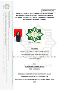 ABSTRAK Rahma Dewi Nofria Rosas, 2025 : Pengaruh Dukungan Keluarga Terhadap Kemampuan Mengelola Emosi Pada Klien Rehabilitasi Narkoba Di Yayasan Generasi Muda Bernilai Pekanbaru Penelitian ini dilatarbelakangi oleh meningkatnya kasus penyalahgunaan narkoba di Indonesia yang menimbulkan dampak serius, tidak hanya bagi penyalahgunanya saja, tetapi juga berdampak pada keluarga, masyarakat, dan negara. Penyalahgunaan narkoba dapat menimbulkan berbagai masalah emosional, seperti kekecewaan, frustasi, marah, dan sedih, hingga kesulitan dalam mengelola emosi. Oleh karena itu, kemampuan mengelola emosi merupakan aspek penting yang perlu diperhatikan dalam proses pemulihan. Salah satu faktor yang berperan penting dalam proses pemulihan dan keberhasilan rehabilitasi adalah dukungan keluarga. Dukungan keluarga dapat memberikan lingkungan yang positif bagi klien. Penelitian ini bertujuan untuk menganalis Pengaruh Dukungan Keluarga Terhadap Kemampuan Mengelola Emosi Pada Klien Rehabilitasi Narkoba Di Yayasan Generasi Muda Bernilai Pekanbaru. Variabel independent pada penelitian ini adalah Dukungan Keluarga dan variabel dependent adalah Kemampuan Mengelola Emosi. Metodologi yang digunakan dalam penelitian ini menggunakan metode kuantitatif dengan pendekatan deskriptif. Data dikumpulkan melalui angket atau kuesioner yang dibagikan kepada 35 klien rehabilitasi sebagai responden. Data dianalisis dengan menggunakan teknik statistic deskriptif untuk dapat mengetahui hubungan antara dukungan keluarga dan kemampuan mengelola emosi bagi klien. Hasil penelitian menunjukkan bahwa terdapat pengaruh dukungan keluarga terhadap kemampuan mengelola emosi bagi klien. Hal ini dapat dilihat dari hasil t hitung (3.197) > t table (1,692) pada taraf signifikansi 5% yang disimpulkan bahwa (Ha) diterima dan (Ho) ditolak. Berdasarkan interpretasi hasil uji korelasi bahwa antara variabel dukungan keluarga (X) dengan variabel kemampuan mengelola emosi (Y) mempunyai hubungan yang cukup dengan nilai korelasi sebesar 0,486. Kemudian R2 atau r Square sebesar 0,236 atau 23,6 %, Sedangkan 76,4 % lainnya faktor lain yang mempengaruhi Variabel (Y) kemampuan mengelola emosi yang tidak diteliti peneliti. Dapat disimpulkan bahwa Dukungan Keluarga berpengaruh terhadap Kemampuan Mengelola Emosi Pada Klien Rehabilitasi Narkoba Di Yayasan Generasi Muda Bernilai Pekanbaru. Kata kunci : Dukungan Keluarga, Kemampuan Mengelola Emosi