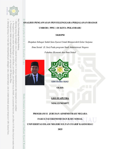 LEO SYAPUTRA, - (2025) ANALISIS PENGAWASAN PENYELENGGARA PERJALANAN IBADAH UMROH ( PPIU ) DI KOTA PEKANBARU. Skripsi thesis, UNIVERSITAS ISLAM NEGERI SULTAN SYARIF KASIM RIAU.