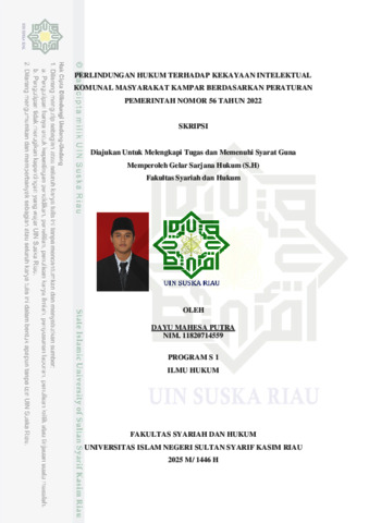 DAYU MAHESA PUTRA, - (2025) PERLINDUNGAN HUKUM TERHADAP KEKAYAAN INTELEKTUAL KOMUNAL MASYARAKAT KAMPAR BERDASARKAN PERATURAN PEMERINTAH NOMOR 56 TAHUN 2022. Skripsi thesis, UNIVERSITAS ISLAM NEGERI SULTAN SYARIF KASIM RIAU.