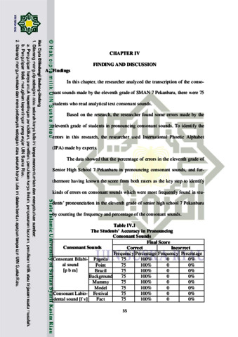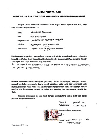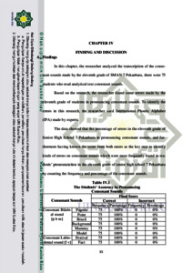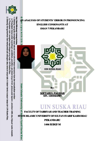 ABSTRAK Miftahul Fauziah, (2025): “Analisis Kesalahan Siswa Dalam Melafalkan onsonan Bahasa Inggris di SMAN 7 Pekanbaru”. Tujuan penelitian ini adalah untuk mengetahui kesalahan siswa dalam pengucapan bunyi konsonan Bahasa Inggris pada teks eksposisi analitis di Sekolah Menengah Atas Negeri 7 Pekanbaru. Oleh karena itu, penelitian ini bertujuan untuk mengetahui kesalahan bunyi paling dominan muncul dalam rekaman pengucapan konsonan Bahasa inggris pada teks eksposisi analitis yang dilakukan oleh siswa Sekolah Menengah Atas Negeri 7 Pekanbaru. Penelitian ini dilakukan tanggal 18 November 2024. Populasi dalam penelitian adalah siswa kelas 11 (Sebelas) Sekolah Menengah Atas Negeri 7 Pekanbaru yang terdiri dari 9 (Sembilan) kelas dengan jumlah 298 siswa, sampelnya adalah 75 siswa yang diambil secara simple random sampling. Selanjutnya, data penelitian ini dikumpulkan melalui tes. Berdasarkan hasil analisis data, penelitian ini menemukan bahwa kesalahan bunyi yang paling banyak dilakukan oleh siswa dalam mengucapkan bunyi konsonan di kelas 11 Sekolah Menengah Atas Negeri 7 Pekanbaru dalam membaca teks eksposisi analitis adalah pada bunyi “th” [θ] dengan persentase kesalahan 91%. Jadi dapat disimpulkan sebagian besar siswa melakukan kesalahan dalam pengucapan bunyi Dental “th” [θ].