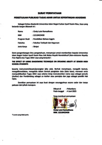 CINDY LUTVI RAMADHONA, - (2025) THE EFFECT OF USING SHADOWING TECHNIQUE ON SPEAKING ABILITY AT SENIOR HIGH SCHOOL STUDENTS. Skripsi thesis, UNIVERSITAS ISLAM NEGERI SULTAN SYARIF KASIM RIAU.