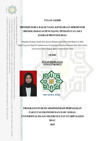 INTAN HERLIANA, - (2025) PROSEDUR BEA BALIK NAMA KENDARAAN BERMOTOR (BBNKB) SEBAGAI PENUNJANG PENDAPATAN ASLI DAERAH PROVINSI RIAU. Laporan thesis, UNIVERSITAS ISLAM NEGERI SULTAN SYARIF KASIM RIAU.