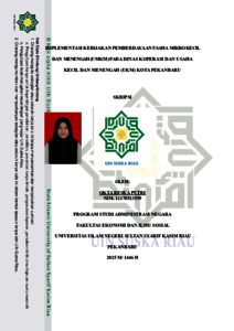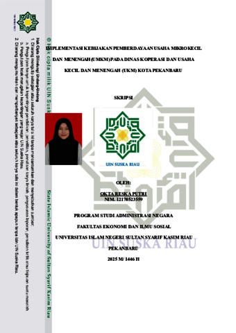 OKTA RESKA PUTRI, - (2025) IMPLEMENTASI KEBIJAKAN PEMBERDAYAAN USAHA MIKRO KECIL DAN MENENGAH PADA DINAS KOPERASI DAN USAHA KECIL MENENGAH KOTA PEKANBARU. Skripsi thesis, Universitas Islam Negeri Sultan Syarif Kasim Riau.