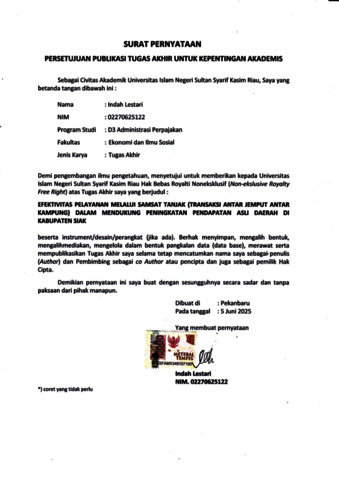 ABSTRAK EFEKTIVITAS PELAYANAN MELALUI SAMSAT TANJAK (TRANSAKSI ANTAR JEMPUT ANTAR KAMPUNG) DALAM MENDUKUNG PENINGKATAKAN PENDAPATAN ASLI DAERAH DI KABUPATEN SIAK Oleh : INDAH LESTARI 02270625122 Pendapatan yang diperoleh pemerintah daerah atas pelaksanaan kegiatan pemerintahan dan pelayanan kepada masyarakat, serta pemanfaatan sumber daya yang dimiliki pemerintah daerah disebut Pendapatan Asli Daerah (PAD), Tugas Akhir ini bertujuan untuk mengetahui efektivitas pelayanan samsat tanjak dalam meningkatkan Pendapatan Asli Daerah (PAD) di Kabupaten Siak. Untuk meningkatkan PAD, diperlukan upaya strategis berupa inovasi pelayanan publik yang mempermudah masyarakat dalam memenuhi kewajiban perpajakan. Salah satu inovasi yang diterapkan di Kabupaten Siak adalah program Samsat Tanjak (Transaksi Antar Jemput Antar Kampung), yaitu layanan jemput bola yang menjangkau masyarakat di wilayah pedesaan untuk memfasilitasi pembayaran pajak kendaraan bermotor. Program ini bertujuan untuk memperluas akses pelayanan serta meningkatkan kepatuhan Wajib Pajak. Hasil kajian menunjukkan bahwa pelayanan melalui Samsat Tanjak memberikan kontribusi positif terhadap peningkatan kesadaran masyarakat dalam membayar pajak, sehingga berdampak pada peningkatan Pendapatan Asli Daerah di Kabupaten Siak. Kata Kunci : PAD, Pajak Kendaraan Bermotor, Samsat Tanjak