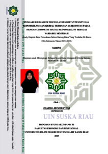 ABSTRAK PENGARUH TRANSFER PRICING, INVENTORY INTENSITY DAN KEPEMILIKAN MANAJERIAL TERHADAP AGRESIVITAS PAJAK DENGAN CORPORATE SOCIAL RESPONSIBILITY SEBAGAI VARIABEL MODERASI (Study Empiris Pada Perusahaan Sektor Barang Baku Yang Terdaftar Di Bursa Efek Indonesia Tahun 2021-2023) Oleh : Zhafira Hendirayani 12170322158 Penelitian ini menganalisis pengaruh transfer pricing, inventory intensity, dan kepemilikan manajerial pada agresivitas pajak dengan corporate sosial responsibility sebagai variabel moderasi. Sampel penelitian terdiri dari 16 perusahaan sektor barang baku yang terdaftar di Bursa Efek Indonesia pada periode 2021-2023 yang dipilih menggunakan teknik purposive sampling. Data dianalisis menggunakan model regresi data panel dengan bantuan software Eviews 12. Temuan penelitian mengungkapkan bahwa secara terpisah, transfer pricing dan kepemilikan manejerial menunjukkan pengaruh negatif terhadap agresivitas pajak. Sedangkan inventory intensity secara signifikan tidak berpengaruh terhadap agresivitas pajak. Corporate sosial responsibility teridentifikasi memperkuat pengaruh negatif transfer pricing terhadap agresivitas pajak. Namun corporate sosial responsibility tidak dapat memoderasi pengaruh transfer pricing dan inventory intensity terhadap agresivitas pajak. Kata Kunci: Transfer pricing, inventory intensity, kepemilikan manajerial, agresivitas pajak, corporate sosial responsibility