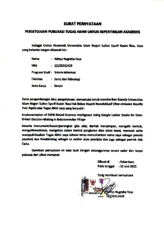 ADITYA NUGRAHA YESA, - (2025) IMPLEMENTATION OF DIKW-BASED BUSINESS INTELLIGENCE USING GOOGLE LOOKER STUDIO FOR DATA-DRIVEN DECISION-MAKING IN BABAKANMULYA VILLAGE. SemanTIK, 11 (1). ISSN ISSN: 2460-1446 e-ISSN: 2502-8928