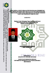 ABSTRAK Aulia Muhammad Farhan (2025): Peran Kepala Dusun Sebagai Penyelenggara Pemerintah Desa Perawang Barat Kecamatan Tualang Kabupaten Siak Berdasarkan Peraturan Menteri Dalam Negeri No 84 Tahun 2015 Perspektif Fiqih Siyasah Penelitian ini membahas tentang peran Kepala Dusun dalam menyelenggarakan pemerintahan desa. Penulisan skripsi ini di latar belakangi oleh diaturnya Pasal 4 Peraturan Menteri Dalam Negeri No 84 Tahun 2015. Peraturan ini menjelaskan tugas yang diberikan kepada kepala dusun, namun dalam praktiknya peran dari kepala dusun kurang terlihat sehingga masyarakat tidak mengetahui apa saja peran dan tugas kepala dusun. Serta kurangnya keikutsertaan kepala dusun dalam urusan administrasi di wilayah kerjanya. Dengan demikian peneliti tertarik untuk merumuskan kedalam bentuk karya ilmiah yaitu skripsi. Penelitian ini menggunakan metode penelitian deskriptif kualitatif dengan pendekatan sosiologis (empiris). Data dikumpulkan melalui observasi, wawancara mendalam bersama Kepala Desa, Perangkat Desa, Kepala Dusun, dan Masyarakat, serta dokumentasi dan studi kepustakaan. Hasil penelitian menunjukkan bahwa pelaksanaan Pasal 4 Peraturan Menteri Dalam Negeri No 84 Tahun 2015 di Desa Perawang Barat belum berjalan secara optimal. Faktor-faktor yang mempengaruhi pelaksanaan Kepala Dusun tersebut meliputi kurangnya sarana dan pra sarana, kurangnya pengawasan pemerintah desa, kurangnya kesadaran masyarakat dan kurangnya keharmonisan sosial. Hasil penelitian disimpulkan bahwa peran kepala dusun di Desa Perawang Barat belum berjalan dengan sempurna. Peran dari kepala dusun masih belum cukup optimal, ada beberapa faktor yang yang menyebabkan terhambatnya penyelenggaraan pemerintah di desa ini yaitu: kurangnya sarana dan prasarana, kurangnya kesadaran masyarakat, kurangnya pengawasan pemerintah, dan ketidakharmonisan sosial, namun ada juga faktor pendukung dalam melaksanakan penyelenggaraan pemerintah di desa ini yaitu: Dukungan kepala desa dan aparatur desa, ketersediaan anggaran dan sarana pendukung, pelatihan peningkatan kapasitas dan parsitipasif aktif masyarakat. Dalam Fiqh siyasah tugas kepala dusun di Desa Perawang Barat belum berjalan sesuai dengan fiqh siyasah dusturiah karena menurut hasil penelitian belum transfaransi dalam hal penyelenggaraan pemerintah desa dan masih kurangnya interaksi dengan masyarakat serta jarang melibatkan masyarakat dalam mengambil keputusan desa. Kata Kunci: Permendagri Nomor 84 Tahun 2015, Desa Perawang Barat, Penyelenggara Pemerintah Desa, Fiqih Siyasah