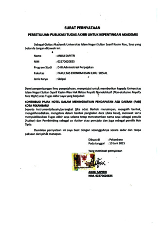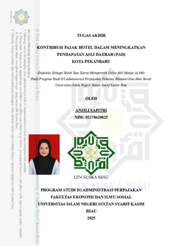 ABSTRAK KONTRIBUSI PAJAK HOTEL DALAM MENINGKATKAN PENDAPATAN ASLI DAERAH (PAD) KOTA PEKANBARU OLEH ANJILI SAPITRI 02270620825 Pajak hotel adalah pajak atas pelayanan yang disediakan oleh hotel. Penelitian ini bertujuan untuk mengetahui kontribusi Pajak Hotel terhadap peningkatan Pendapatan Asli Daerah (PAD) Kota Pekanbaru dan upaya Badan Pendapatan Daerah (BAPENDA) dalam optimalisasi penerimaan pajak tersebut. Metode yang digunakan adalah metode deskriptif dengan pendekatan kualitatif dan kuantitatif, melalui pengumpulan data primer (wawancara dan observasi) serta data sekunder (dokumen Bapenda dan literatur). Hasil penelitian menunjukkan bahwa kontribusi Pajak Hotel terhadap PAD Kota Pekanbaru mengalami peningkatan setiap tahun dalam periode 2020–2024, dengan persentase kontribusi berturut-turut sebesar 4,31%, 4,89%, 5,05%, 5,28%, hingga 7,39%. Upaya Bapenda dalam meningkatkan penerimaan pajak hotel antara lain melalui pemasangan alat Tapping Box untuk merekam transaksi secara real time, intensifikasi pengawasan, serta pemberian Surat Tagihan Pajak (STP) secara berkala. Temuan ini menunjukkan bahwa sektor perhotelan memiliki potensi signifikan dalam mendukung kemandirian fiskal daerah. Diharapkan pemerintah daerah terus mengembangkan strategi inovatif dalam pengelolaan pajak untuk meningkatkan pendapatan daerah. Kata Kunci: Pajak Hotel, Pendapatan Asli Daerah (PAD), Badan Pendapatan Daerah, Pekanbaru.