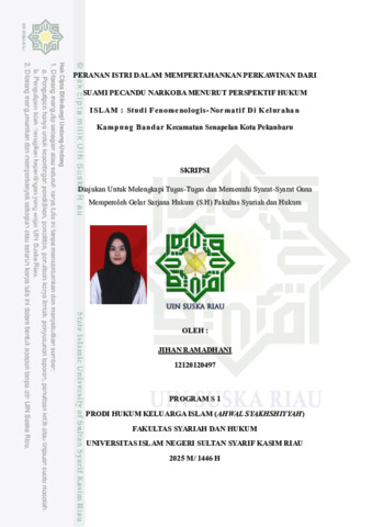 ABSTRAK Jihan Ramadhani, (2025) : Peranan Istri Dalam Mempertahankan Perkawinan Dari Suami Pecandu Narkoba Menurut Perspektif Hukum Islam : Studi Fenomenologis-Normatif Kelurahan Kampung Banadr Kecamatan Senapelan Kota Pekanbaru Pe.ne.litian ini dilatar be.lakangi ole.h pe.rmasalahan ke.te.rgantungan narkoba yang me.nimpa suami me.njadi tantangan se.rius dalam ke.hidupan rumah tangga, te.rutama bagi istri yang harus be.rjuang me.mpe.rtahankan pe.rkawinan. Di Ke.lurahan Kampung Bandar, Ke.camatan Se.nape.lan, Kota Pe.kanbaru, dite.mukan fe.nome.na sosial di mana dite.mukan istri te.tap me.milih untuk me.mpe.rtahankan pe.rkawinan me.skipun suaminya te.rlibat pe.nyalahgunaan narkoba. Dalam konte.ks ini, pe.ranan istri me.njadi sangat pe.nting, baik se.cara e.mosional, spiritual, sosial, maupun moral. Hal ini me.narik bagi pe.ne.liti untuk me.ngkajinya dari aspe.k hukum, me.njadi hal yang dipe.rtanyakan apakah me.mpe.rtahankan pe.rkawinan dari suami pe.candu narkoba se.suai de.ngan syariat Islam atau be.rte.ntangan de.ngan hukum Islam. Adapun pe.rmasalahan dalam pe.ne.litian ini adalah bagaimana pe.ranan istri me.mpe.rtahankan pe.rkawinan dari suami pe.candu narkoba se.rta bagaimana pe.rse.pe.ktif hukum Islam te.rhadap pe.ranan istri dalam me.mpe.rtahakan pe.rkawinan dari suami pe.candu narkoba. Me.tode. pe.ne.litian ini te.rdiri dari je.nis pe.ne.litian lapangan (fie.ld re.se.arch) de.ngan me.nggunakan pe.nde.katan de.skriptif kualitatif se.rta pe.nde.katan sosiologis. Lokasi pe.ne.litian ini adalah di RT 002/RW 001 Ke.lurahan Kampung Bandar, Ke.camatan Se.nape.lan, Kota Pe.kanbaru, Provinsi Riau. Informan dalam pe.ne.litian ini adalah tiga orang istri yang me.mpe.rtahankan pe.rkawinan dari suami te.rindikasi pe.candu narkoba. Te.knik pe.ngumpulan data dilakukan me.lalui obse.rvasi dan wawancara de.ngan para informan. Te.knik analisis data me.nggunkaan me.tode. de.skriptif kualitatif. Hasil pe.ne.litian me.nunjukkan bahwa istri te.tap me.mpe.rtahankan pe.rkawinan dari suami pe.candu narkoba kare.na anak, be.lum siap me.njadi janda, dan adanya harapan suami be.rubah. Usaha yang dilakukan me.liputi me.ngingatkan suami, me.ndoakan, dan be.rsabar. Dalam pe.rspe.ktif hukum Islam, sikap ini se.suai de.ngan QS. At-Tahrim ayat 6, yang me.me.rintahkan me.njaga ke.luarga dari api ne.raka, se.rta QS. An-Nisa ayat 128, yang me.ne.kankan pe.ntingnya pe.rdamaian dalam rumah tangga. Namun, Islam juga me.mbe.ri ruang untuk khuluʿ jika ke.rusakan le.bih be.sar dikhawatirkan, be.rdasarkan prinsip dar’u al-mafāsid muqaddam ‘alā jalb al-maṣāliḥ. Kata Kunci : Peranan Istri, Perkawinan, Pecandu Narkoba, Hukum Islam.