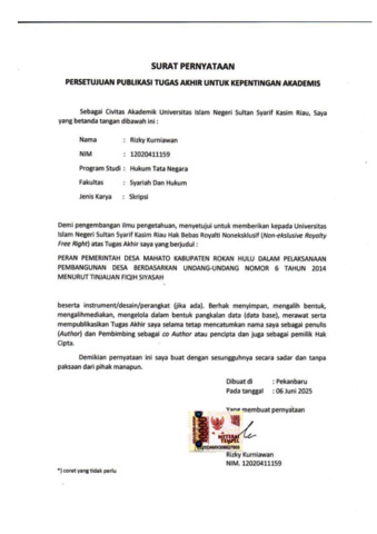 RIZKY KURNIAWAN, - (2025) PERAN PEMERINTAH DESA MAHATO KABUPATEN ROKAN HULU DALAM PELAKSANAAN PEMBANGUNAN DESA BERDASARKAN UNDANG-UNDANG NOMOR 6 TAHUN 2014 MENURUT TINJAUAN FIQIH SIYASAH. Skripsi thesis, UNIVERSITAS ISLAM NEGERI SULTAN SYARIF KASIM RIAU.