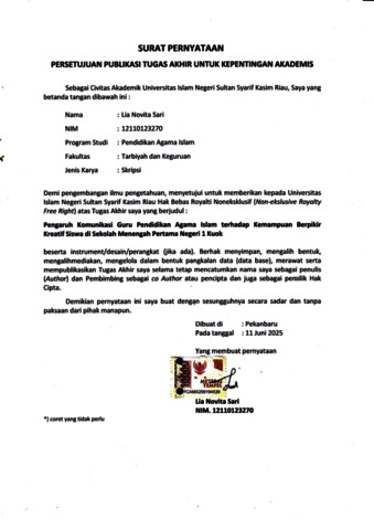 LIA NOVITA SARI, - (2025) PENGARUH KOMUNIKASI GURU PENDIDIKAN AGAMA ISLAM TERHADAP KEMAMPUAN BERPIKIR KREATIF SISWA DI SEKOLAH MENENGAH PERTAMA NEGERI 1 KUOK OLEH LIA NOVITA. Skripsi thesis, UIN SUSKA.