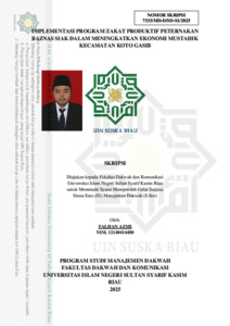 ABSTRAK Nama : Falhan Azmi Nim : 12140414480 Jurusan : Manajemen Dakwah Judul : Implementasi Program Zakat Produktif Peternakan BAZNAS Siak Dalam Meningkatkan Ekonomi Mustahik Kecamatan Koto Gasib Badan Amil Zakat Nasional (BAZNAS) Kabupaten Siak dengan program zakat produktif dibidang peternakannya berupaya untuk meningkatkan taraf ekonimi penerima program (mustahik). Penelitian ini bertujuan untuk mendeskripsikan dan menganalisis implementasi program zakat produktif peternakan yang dilakukan oleh BAZNAS Kabupaten Siak sebagai upaya meningkatkan ekonomi mustahik di Kecamatan Koto Gasib. Metode yang digunakan dalam penelitian ini adalah kualitatif-deskriktif dengan teknik pengumpulan data berupa wawancara, observasi, dan dokumentasi. Analisis data dilakukan melalui content analysis. Hasil penelitian ini menunjukkan bahwa program zakat produktif dibidang peternakan oleh BAZNAS Kabupaten Siak telah memberikan peningkatan ekonomi pada sebagian penerima program (mustahik), meskipun terdapat kendala berupa kematian ternak dan tantangan berupa lemahnya keterampilan peternak. Penelitian ini merekomendasikan perlunya seleksi mustahik yang lebih ketat, pelatihan teknis berkelanjutan, serta kerja sama dengan dinas terkait untuk menjamin keberhasilan program secara berkelanjutan. Kata Kunci: implementasi program, zakat produktif peternakan, BAZNAS Siak, peningkatan ekonomi mustahik