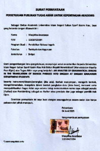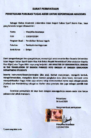 MASYITHA ANASTASYA, - (2025) AN ANALYSIS OF GRAMMATICAL ERRORS IN THE TRANSLATION OF BAHASA PHRASES INTO ENGLISH AT ENGLISH EDUCATION DEPARTMENS STUDENTS. Skripsi thesis, UNIVERSITAS ISLAM NEGERI SULTAN SYARIF KASIM RIAU.