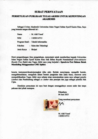 M. ALDI YUSUF, - (2025) SPEECH-TO-TEXT BAHASA BATAK MANDAILING MENGGUNAKAN CMU SPHINX. Skripsi thesis, UIN SUSKA.