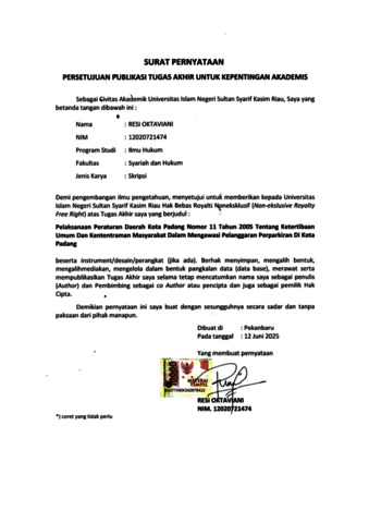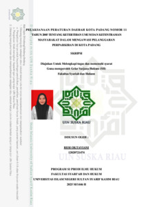 ABSTRAK Resi Oktaviani (2025) Pelaksanaan Peraturan Daerah Kota Padang Nomor 11 Tahun 2005 tentang Ketertiban Umum dan Ketentraman Masyarakat Dalam Mengawasi Pelanggaran Perparkiran di Kota Padang. Penulisan skripsi ini dilatarbelakangi oleh pesatnya pertumbuhan penduduk di Kota Padang, pertumbuhan penduduk juga tidak terlepas dari pesatnya jumlah kendaraan dikota Padang dilihat bahwa Kota Padang mempunyai budaya dan destinasi wisata yang menarik buat dikunjungi banyak orang, hal ini yang memicu timbulnya parkir liar, sehingga dalam hal ini pentingnya pengawasan terhadap perparkiran liar di Kota Padang sebagaimana yang di atur pada Peraturan Daerah Kota Padang Nomor 11 Tahun 2005 tentang Ketertiban Umum dan Ketentraman Masyarakat, yang bertujuan untuk menciptakan tata kelola parkir yang lebih teratur dan mendukung ketertiban umum. Namun, pelaksanaan tugas ini sering kali menghadapi berbagai kendala, baik dari aspek hukum, sosial, maupun sumber daya. Penelitian ini bertujuan untuk mengetahui bagaimana Pelaksanaan Peraturan Daerah Kota Padang Nomor 11 Tahun 2005 tentang Ketertiban Umum dan Ketentraman Masyarakat Dalam Mengawasi Pelanggaran Perparkiran di Kota Padang. serta apa saja faktor kendala sehingga masih ada pelanggaran perparkiran di kota padang. Penelitian ini menggunakan metode penelitian hukum empiris dengan pendekatan yuridis-sosiologis. Data diperoleh dari wawancara dengan anggota Satpol PP, dokumen peraturan daerah, serta observasi langsung di lapangan. Hasil penelitian menunjukkan bahwa pelaksanaan Peraturan Daerah Kota Padang Nomor 11 Tahun 2005 tentang Ketertiban Umum dan Ketenteraman Masyarakat belum berjalan secara optimal, khususnya dalam aspek perparkiran. Masih ditemukan sejumlah pelanggaran berupa penggunaan badan jalan dan trotoar sebagai lahan parkir tanpa izin dari Wali Kota atau pejabat yang berwenang. Faktor-faktor yang menjadi penyebab utama kurang efektifnya pelaksanaan peraturan ini antara lain adalah terdapat kendala hukum berupa tidak spesifiknya pengaturan mengenai jenis-jenis pelanggaran parkir dan ketentuan sanksi yang diberlakukan, yang berdampak pada lemahnya penegakan hukum di lapangan, sumber daya manusia yang bertugas dalam pengawasan dan penindakan, keterbatasan sarana dan prasarana pendukung, kurangnya sosialisasi terkait perparkiran, serta rendahnya tingkat kesadaran dan pengetahuan masyarakat terhadap pentingnya kepatuhan terhadap aturan parkir. Kata Kunci: Pelaksanaan, Pelanggaran Perparkiran, Peraturan Daerah, Ketertiban Umum.