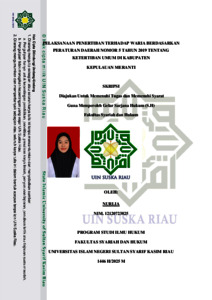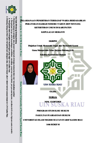 NURLIA(2025) : PELAKSANAAN PENERTIBAN TERHADAP WARIA BERDASARKAN PERATURAN DAERAH NOMOR 5 TAHUN 2019 TENTANG KETERTIBAN UMUM DI KABUPATEN KEPULAUAN MERANTI,,,Didalam Peraturan Daerah Kabupaten Kepulauan Meranti Nomor 5 Tahun 2019 tentang Ketertiban Umum pada bab VI pasal 19 menyebutkan bahwa Setiap orang dilarang berlaku sebagai waria yang melakukan kegiatan menggangu ketertiban dengan berkeliaran ditempat umum seperti taman, jalan dan fasilitas umum lainnya serta melakukan kegiatan pelacuran. Namun fakta dilapangan ditemukan bahwa masih banyak waria berkeliaran di kota selatpanjang. Masalah dari penelitian ini adalah bagaimana pelaksanaan penertiban terhadap waria berdasarkan Peraturan Daerah Nomor 5 tahun 2019 dan apa kendala dalam menerapkannya. Tujuan dari penelitian ini adalah untuk menjelaskan pelaksanaan penertiban terhadap waria dan mengetahui kendalanya ditinjau dari Peraturan Daerah Nomor 5 tahun 2019 tentang Ketertiban Umum. Jenis penelitian yang digunakan penulis dalam penelitian yaitu penelitian hukum empiris dengan pendekatan kualitatif. Menggunakan teknik pengumpulan data dengan cara observasi, wawancara, angket dan studi kepustakaan. Penelitian ini dilakukan di daerah kawasan Kota Selatpanjang Kabupaten Kepulauan Meranti dengan instansi pemerintah terkait yaitu Satpol PP (Satuan Polisi Pamong Praja dan Pemadam Kebakaran) Kabupaten Kepulauan Meranti. Dari hasil penelitian ini dapat ditarik sebuah kesimpulan bahwa Pelaksanaan Penertiban terhadap waria berdasarkan Peraturan Daerah Nomor 5 tahun 2019 tentang Ketertiban Umum di Kabupaten Kepulauan Meranti tidak berjalan optimal. Hal ini dikarenakan adanya stigma dan diskriminasi, kurangnya pendekatan persuasif dan edukasi, keterbatasan kapasitas aparat penegak perda, ketiadaan regulasi pendukung dan alternatif solusi, tantangan koordinasi antar instansi. Untuk itu upayanya yang dilakukan adalah melakukan koordinasi fungsional antar instansi, melakukan penertiban terhadap waria, melakukan sosialisasi kepada waria, melakukan pendataan terhadap waria dan meningkatkan pengawasan dengan melakukan pemantauan langsung dilapangan. Kata Kunci: Pelaksanaan, Penertiban, Waria, Ketertiban Umum,