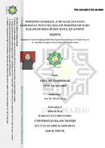Abstrak Penelitian ini mengkaji persepsi generasi Z Muslim tentang kebebasan manusia dalam perspektif ilmu kalam di Desa Bukit Raya, Kuansing. Generasi Z, yang didefinisikan sebagai individu yang lahir antara tahun 1998 hingga 2009 dan tumbuh dengan ketergantungan pada teknologi digital, menjadi fokus utama penelitian ini. Penelitian ini bertujuan untuk memahami bagaimana generasi Z di Desa Bukit Raya memaknai dan mengaplikasikan konsep kebebasan manusia dalam kehidupan sehari-hari, serta mengidentifikasi faktor-faktor yang memengaruhi persepsi mereka. Penelitian ini menemukan bahwa generasi Z di Desa Bukit Raya memiliki pemahaman yang beragam tentang kebebasan manusia, dipengaruhi oleh faktor internal seperti pemahaman agama dan faktor eksternal seperti lingkungan sosial dan budaya. Secara umum, mereka memahami kebebasan sebagai hak untuk bertindak dan berpikir sesuai kehendak, namun dengan batasan tanggung jawab dan norma sosial. Konsep kebebasan ini diperdebatkan di kalangan generasi Z, dengan sebagian besar meyakini hak individu untuk menentukan pilihan hidup, namun di sisi lain menyadari adanya batasan sosial, budaya, dan agama. Dilema internal muncul akibat adanya kesenjangan antara pemahaman ideal tentang kebebasan dan realitas kehidupan sehari-hari. Ilmu kalam, sebagai cabang ilmu dalam Islam yang membahas dasardasar akidah dan doktrin ajaran Islam, menjadi kerangka analisis yang relevan dalam penelitian ini. Konsep kehendak bebas (ikhtiyar) dan tanggung jawab moral dalam ilmu kalam membantu memahami persepsi generasi Z tentang kebebasan. Penelitian ini juga menyoroti pengaruh globalisasi dan digitalisasi terhadap cara pandang generasi Z terhadap kebebasan, di mana kemudahan akses informasi dan tekanan untuk eksis di media sosial turut membentuk pemahaman mereka. Penelitian ini diharapkan dapat memberikan kontribusi teoretis dan praktis dalam memahami persepsi generasi Z Muslim tentang kebebasan manusia, serta memberikan wawasan bagi peneliti selanjutnya. Kata kunci: Generasi Z Mulim, Desa Bukit Raya, Kebebasan Manusia.