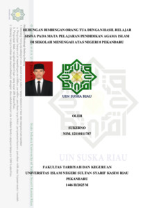 ABSTRAK Sukerno, (2025): Hubungan Bimbingan Orang Tua dengan Hasil Belajar Siswa pada Mata Pelajaran Pendidikan Agama Islam Sekolah Menengah Atas Negeri 8 Pekanbaru. Hasil belajar merupakan aspek yang penting dalam dunia pendidikan, dan hal ini disebabkan oleh beberapa faktor, diantaranya, bimbingan dari orang tua masing-masing. Penelitian ini bertujuan untuk menguji hubungan bimbingan orang tua dengan hasil belajar siswa pada mata pelajaran Pendidikan Agama Islam Sekolah Menengah Atas Negeri 8 Pekanbaru. Penelitian ini menggunakan pendekatan kuantitatif dengan desain korelasi. Populasi penelitian ini berjumlah 565 orang dengan penarikan sampel sebesar 15% sehingga jumlah sampel 90 orang. Pengambilan sampel menggunakan teknik propotional random sampling. Pengumpulan data menggunakan angket, dokumentasi dan test. Teknik analisis data menggunakan uji korelasi product moment. Berdasarkan hasil penelitian menujukan bahwa nilai rhitung > rtabel yaitu, 0,207 < 0,435 > 0,174 pada taraf signifikasi 5% maupun 1%. Berdasarkan hasil tersebut, maka Ha diterima dan H0 ditolak, yang berarti terdapat hubungan yang signifikan dari bimbingan orang tua dengan hasil belajar siswa pada mata pelajaran Pendidikan Agama Islam di Sekolah Menengah Atas Negeri 8 Pekanbaru. Kata Kunci: Bimbingan Orang Tua, Hasil Belajar.