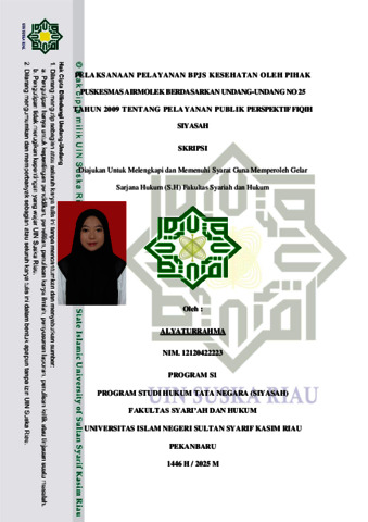 ABSTRAK ALYATURRHMA (2025): Pelaksanaan Pelayanan Bpjs Kesehatan Oleh Pihak Puskesmas Airmolek Berdasarkan Undang-Undang No 25 Tahun 2009 Pasal 34 Tentang Pelayanan Publik Perspektif Fiqih Siyasah Pe.ne.litian ini dilatarbe.lakangi ole.h prioritas pe.layanan yang tidak se.suai de.ngan Undang-undang Nomor 25 Tahun 2009 te.ntang Pe.layanan Publik di Puske.smas De.sa Air Mole.k.Se.dangkan dalam Islam sudah ada ayat yang me.mbe.rikan pe.ringatan ke.ras agar manusia be.rlaku adil dan be.rbuat ke.bajikan se.rta me.njunjung tinggi nilai ke.jujuran, tanggung jawab untuk be.rpe.rilaku be.nar dan amanah dalam me.wujudkan ke.maslahatan atau ke.se.jahte.raan. Rumusan masalah dalam pe.ne.litian ini bagaimana pe.layanan jaminan sosial ke.se.hatan di Puske.smas Air Mole.k dan bagaimana tinjauan fiqih siyasah te.rhadap pe.layanan jaminan sosial ke.se.hatan di Puske.samas Air Mole.k. Tujuan pe.ne.litian ini untuk me.nge.tahui bagaimana pe.layanan dan tinjauan fiqih siyasah te.rhadap pe.layanan jaminan sosial Ke.se.hatan be.rdasarkan Undang-undang nomor 25 tahun 2009 pasal 34 te.ntang pe.layanan public (study kasus di Puske.smas Air Mole.k). Adapun pe.ne.litian ini me.nggunankan me.tode. pe.ne.litian lapangan (fie.ld re.se.arch). Sumbe.r data dari pe.ne.litian ini adalah data prime.r, data se.kunde.r, dan data te.rsie.r. Te.knik pe.ngumpulan data me.ngunakan te.knik obse.rvasi, wawancara, dokume.ntas, dan studi ke.pustakaan. Te.knik analisis data de.ngan me.nggunakan te.knik analisis de.skriptif kualitatif. Hasil dari pe.ne.litian ini adalah Puske.smas Air Mole.k me.rupakan instansi pe.layanan ke.se.hatan milik pe.me.rintah yang be.rada di bawah naungan Dinas Ke.se.hatan Kabupate.n Indragiri Hulu, Provinsi Riau. Se.bagai unit pe.layanan ke.se.hatan tingkat pe.rtama, Puske.smas ini be.rfungsi me.mbe.rikan pe.layanan me.dis dasar ke.pada masyarakat, te.rmasuk dalam pe.laksanaan program BPJS Ke.se.hatan. Pe.laksanaa pe.layanan Bpjs ke.se.hatan be.rdasrkan Undang Undang Nomor 25 Tahun 2009 Te.ntang Pe.layanan Publik te.rhadap pe.layanan ke.se.hatan bagi pe.ngguna BPJS di Puske.smas Air Mole.k,Ke.camatan Pasir Pe.nyu Kabupate.n Indragiri, de.ngan me.nilik pada Pasal 34 Undang Undang Nomor 25 Tahun 2009 te.ntang Pe.layanan Publik, pihak dari Puske.smas Air mole.k sudah me.njalankan hal-hal te.rse.but ke.pada masyarakat, me.skipun masih ada masyarakat yang tidak puas de.ngan be.ntuk pe.layanan yang di be.rikan.Hal ini dise.babkan kare.na ada ke.ndala-ke.ndala yang dihadapi se.pe.rti kurang nya te.naga me.dis, dan ke.te.rbatasan insfrastruktur.Dalam pandangan Fiqih Siyasah Dusturiyah, Puske.smas dapat dipahami se.bagai le.mbaga pe.layanan publik yang me.rupakan pe.rpanjangan tangan dari pe.me.rintah (waliyul amr) dalam me.me.nuhi ke.wajiban ne.gara te.rhadap rakyat, khususnya dalam bidang ke.se.hatan.se.bagaimana diamanatkan pada Pasal 34 Undang Undang Nomor 25 Tahun 2009 te.ntang Pe.layanan Publik. Kata Kunci:Pelaksanaan, Pelayanan BPJS, Fiqih Siyasah