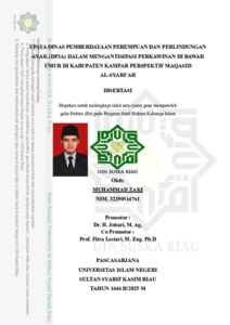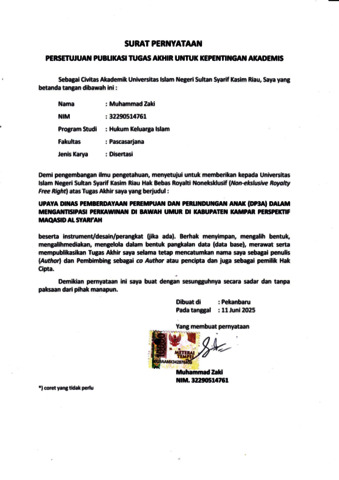 ABSTRAK Muhammad Zaki (32290514761) : Upaya Dinas Pemberdayaan Perempuan dan Perlindungan Anak (Dp3A) Dalam Mengantisipasi Perkawinan di bawah umur di Kabupaten Kampar Perspektif Maqasid Al-Syari’ah Penelitian ini membahas tentang Perkawinan di bawah umur yang terjadi di kabupaten kampar, dilihat dari data yang ada Perkawinan di bawah umur di Indonesia Meningkat dari tahun ke tahunnya, apalagi UNICEF sudah menetapkan Indonesia sudah termasuk Fase Darurat Perkawinan di bawah umur, akan tetapi berbanding terbalik dengan Provinsi Riau lebih khususnya Kabupaten Kampar dimulai dari tahun 2021-2024 Perkawinan di bawah umur semakin menurun secara signifikan, Penelitian ini bertujuan untuk mengetahui Penyebab turunnya Perkawinan di bawah umur dikabupaten Kampar dan bagaimana Perspektif Maqasid Al-Syariah melihatnya, Adapun Rumusan Masalah Penelitian ini: 1) Bagaimanan Penyebab Perkawinan di bawah umur di Kabupaten Kampar?, 2) Apa Upaya Pencegahan Perkawinan di bawah umur yang dilakukan oleh Dp3A di Kabupaten Kampar?, 3) Bagaimana Perspektif Maqasid Al Syari‟ah Terhadap Pencegahan Perkawinan di bawah umur yang dilakukan oleh Dp3A di Kabupaten Kampar, Adapun Metode Penelitian ini menggunakan Yuridis Empiris yang dilakukan dengan menggunakan metode Penelitian Lapangan (Field Research) yaitu data diperoleh dengan melakukan penelitian langsung ke lapangan, Kriteria data yang digunakan yaitu data Primer, data ini berupa hasil wawancara dengan Kepala Dinas (Dp3A) Kepala Uptd Perlindungan perempuan dan Anak, Konselor Psikologi, Advokat, Tenaga Ahli Kerohanian, Tenaga Ahli Kesehatan, Hakim, Kantor Urusan Agama, Pengumpulan data dilakukan dengan metode observasi dan wawancara, Hasil dari Penelitian ini, Penyebab Perkawinan di bawah umur yang terjadi di kabupaten Kampar ada beberapa Penyebab seperti Pergaulan bebas, faktor biaya, kebiasaan tempat dan Pendidikan yang sangat minim untuk orang tua dan anaknya, Upaya yang digunakan dalam Mengantisipasi Perkawinan di bawah umur dengan memperketat Surat dispensasi Nikah, Sosialisasi ke Desa dan Sekolah, Edukasi, Kolaborasi dan Memberikan Ancaman serta Evaluasi, Perspektif Maqasid Al-Syariah ini sudah sampai ke tahap daruriyah dan Upaya pencegahan Perkawinan di bawah umur yang dilakukan oleh DP3A bisa eliminasi atau minimalisir dalam menjaga kebutuhan esensial dari lima aspek: Menjaga Agama, Menjaga Akal, Menjaga Jiwa, Menjaga Keturunan dan Menjaga Harta, Dalam Penelitian ini dapat disimpulkan Pencegahan Perkawinan di bawah umur yang dilakukan Oleh Dinas Pemberdayaan Perempuan dan Perlindungan Anak Sudah Sesuai dengan Tupoksi dan Perlu ditingkatkan lagi metode yang sesuai dengan zamannya. Kata Kunci: Pencegahan, Perkawinan di bawah umur, Dp3A, Maqasid Al-Syari’ah