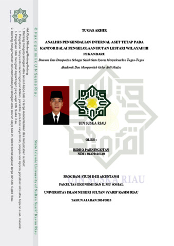 RIDHO PARNINGOTAN, - (2025) ANALISIS PENGENDALIAN INTERNAL ASET TETAP PADA KANTOR BALAI PENGELOLAAN HUTAN LESTARI WILAYAH III PEKANBARU. Skripsi thesis, Universitas Islam Negeri Sultan Syarif Kasim Riau.