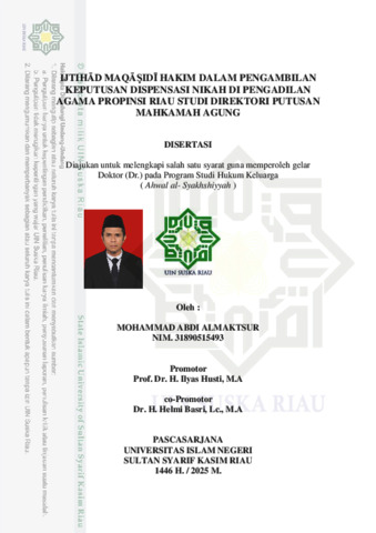 ABSTRAK Mohammad Abdi Almaktsur (2025): Ijtihād Maqāṣidī Hakim Dalam Pengambilan Keputusan Dispensasi Nikah Di Pengadilan Agama Propinsi Riau Studi Direktori Putusan Mahkamah Agung Penelitian ini bertujuan untuk mengetahui bagaimana Ijtihād Maqāṣidī Hakim Dalam Pengambilan Keputusan Dispensasi Nikah Di Pengadilan Agama Propinsi Riau Studi Direktori Putusan Mahkamah Agung. Adapun Rumusan masalah dalam penelitian ini adalah Bagaimana putusan dispensasi nikah pada Pengadilan Agama yang ada di Provinsi Riau? Bagaimana Pertimbangan hakim dalam putusan dispensasi nikah? Bagaimana implikasi ijtihād maqāṣidi terhadap putusan dispensasi nikah? Penelitian ini menggunakan metode kualitatif berbasis studi pustaka. Hasil penelitian menunjukkan bahwa terdapat variasi dalam putusan dispensasi nikah, baik yang dikabulkan maupun yang ditolak. Mayoritas permohonan dikabulkan karena alasan sosial dan moral seperti, saling menjalin cinta, adanya hubungan layaknya suami istri hingga kehamilan di luar nikah . Penolakan dilakukan ketika tidak terpenuhi syarat yuridis dan sosiologis, seperti ketidaksiapan mental, ekonomi, dan tidak adanya urgensi yang cukup. Pertimbangan hakim didasarkan pada peraturan perundang-undangan, seperti Undang-Undang Nomor 16 Tahun 2019 dan Peraturan Mahkamah Agung Nomor 5 Tahun 2019 dengan tetap berpedoman pada Undang Undang no 23 tahun 2002 tentang Perlindungan anak, serta memperhatikan aspek psikologis anak, kondisi keluarga, dan lingkungan sosial. Dari sudut pandang ijtihād maqāṣidi, putusanputusan tersebut perlu pendalaman dan pengayaan dalil syar.i, untuk mencerminkan upaya perlindungan terhadap lima maqāṣid al-sharī„ah, khususnya menjaga agama (ḥifẓ al-dīn), jiwa (ḥifẓ al-nafs), dan keturunan (ḥifẓ al-nasl). Pengabulan maupun penolakan permohonan didasarkan pada pertimbangan maslahat dan pencegahan mudarat yang sesuai dengan prinsip-prinsip syariah. Kata Kunci: Ijtihād Maqāṣidī Hakim, Dispensasi Nikah