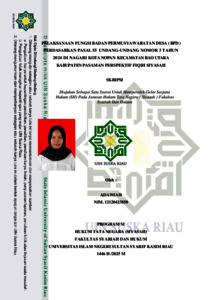 Pelaksanaan Fungsi Badan Permusyawaratan Desa (BPD) Berdasarkan Pasal 55 Undang-Undang Nomor 3 Tahun 2024 Di Nagari Kota Nopan Kecamatan Rao Utara Kabupaten Pasaman Perspektif Fiqih Siyasah Badan Pe.rmusyawaratan De.sa (BPD) me.miliki posisi yang se.tara de.ngan salah satu unsur dari pe.me.rintahan de.sa, yaitu ke.pala de.sa. Langkah ini te.ntu dimaksudkan untuk me.njaga ke.se.imbangan ke.kuasaan antara Ke.pala De.sa se.bagai pe.laksana pe.me.rintahan dan Badan Pe.rmusyawaratan yang ada. Adapun permasalahan dari pe.ne.litian ini adalah 1) Bagaimana pe.laksanaan fungsi Badan Pe.rmusyawaratan De.sa (BPD) Be.rdasarkan Pasal 55 Undang-Undang Nomor 3 Tahun 2024 di Nagari Kota Nopan Ke.camatan Rao Utara Kabupate.n Pasaman Perspektif Fiqih Siyasah. 2) Bagaimana analisis Fiqih Siyasah Dusturiyah te.rhadap pe.laksanaan fungsi Badan Pe.rmusyawaratan De.sa (BPD) Berdasarkan Pasal 55 Undang- Undang Nomor 3 Tahun 2024 di Nagari Kota Nopan Ke.camatan Rao Utara Kabupate.n Pasaman. Teknik pe.ngumpulan data yang digunakan adalah obse.rvasi, wawancara dan dokume.ntasi. Teknik analisis data yang digunakan pada pe.ne.litian ini adalah dengan Metode analisis de.skriptif kualitatif. Sumbe.r data prime.r yanag digunakan diambil langsung dari Kepala Desa, Se.kre.taris De.sa, anggota badan pe.rmusyawaratan de.sa, dan masyarakat di Nagari Kota Nopan. Sedangkan sumbe.r data se.kunde.r dilakukan dengan mengambil membaca buku-buku, peraturan perundang-undangan yang erat kaitannya denga masalah yang sedang diteliti. Hasil penelitian ini menunjukkan bahwa, pelaksanaan fungsi badan permusyawaratan desa (BPD) di Nagari Kota Nopan ini dengan mengadakan musyawarah desa bersama kepala desa, pemerintahan desa, dan anggota BPD. yang dilakukan dengan satu kali atau dua kali dalam satu bulan. adapun faktor-faktor pendukung fungsi BPD adalah, adanya dana, masyarakat, serta hubungan kerja sama dengan pemerintah desa. Sedangkan faktor penghambat nya adalah, waktu yang dimiliki oleh BPD dan kepala desa dalam berbaur dengan masyarakat, karna antara BPD dan kepala desa juga memiliki kesibukan lain seperti dalam memenuhi tanggung jawab sebagai kepala rumah tangga dan kesibukan-kesibukan yang lainnya. Berdasarkan tinjauan fiqih siyasah Dusturiyyah belum sepenuhnya terlaksana dan belum sesuai dengan lembaga Ahl- al-Hall Wa al-„Aqdi karena dalam hal peraturan desa BPD sudah pernah mengadakan musyawarah bersama masyarakat untuk membahas dan merancang peraturan desa.