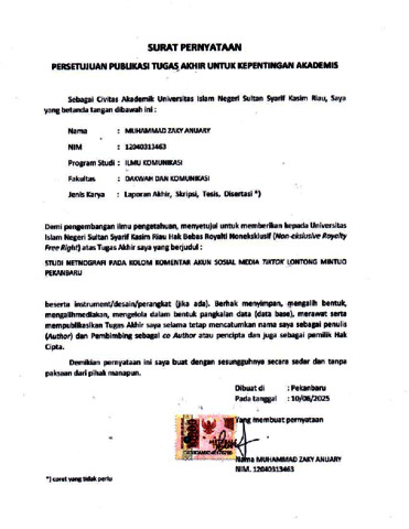 MUHAMMAD ZAKY ANUARY, - (2025) STUDI NETNOGRAFI PADA KOLOM KOMENTAR AKUN SOSIAL MEDIA TIKTOK LONTONG MINTUO PEKANBARU. Skripsi thesis, Universitas Islam Negeri Sultan Syarif Kasim Riau.