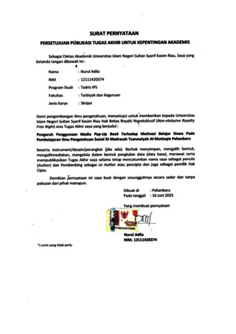 ABSTRAK Nurul Adila (2025) : Pengaruh Penggunaan Media Pop-Up Book Terhadap Motivasi Belajar Siswa pada Pembelajaran Ilmu Pengetahuan Sosial di Madrasah Tsanawiayah Al-Muttaqin Pekanbaru Penelitian ini bertujuan untuk mengetahui besarnya pengaruh media pembelajaran pop-up book terhadap motivasi belajar siswa pada pembelajaran Ilmu Pengetahuan Sosial di Madrasah Tsanawiyah Al-Muttaqin Pekanbaru. Penelitian ini dilatarbelakangi oleh rendahnya motivasi belajar siswa diantaranya: siswa kurang semangat dalam belajar dan kurang adanya dorongan dalam belajar. Penelitian menggunakan pendekatan kuantitatif dengan metode quasi eksperimen. Adapun populasi penelitian ini siswa kelas VII berjumlah 255 siswa. pengambilan sampel menggunakan Purposive Sampling. Sampel yang digunakan dalam penelitian ini berjumlah 68 siswa. Teknik pengumpulan data observasi, angket dan dokumentasi. Teknik analisis data dilakukan dengan uji deskriptif kuantitatif, uji normalitas, uji homogenitas, uji hipotesis, uji effect size dan uji N-gain score. Berdasarkan hasil penelitian dan analisis data bahwa media pembelajaran pop-up book dapat mempengaruhi motivasi belajar siswa pada pembelajaran Ilmu Pengetahuan Sosial di Madrasah Tsaanawiyah Al-Muttaqin Pekanbaru. Hal ini dapat dibuktikan dengan hasi perhitungan memperoleh nilai thitung 4,335 > ttabel 1,668 dengan nilai signifikan 0,000 < 0,05 yang berarti Ha diterima dan Ho ditolak. Adapun persentase pengaruh media pop-up book terhadap motivasi belajar siswa dari perhitungan effect size sebesar 0,53 (0,53%) dengan kategori Moderate Effect (efek sedang). Sedangkan sisanya dipengaruhi oleh variable lain Kata Kunci: Media Pop-Up Book, Motivasi Belajar, Pembelajaran IPS