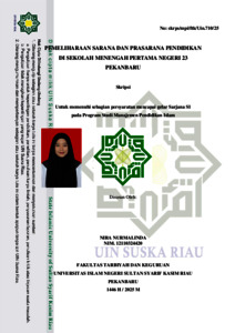 ABSTRAK Nira Nurmalinda, (2025): Penelitian ini bertujuan untuk menganalisis pemeliharaan sarana dan prasarana pendidikan di SMP Negeri 23 Pekanbaru. Penelitian ini menggunakan metode penelitian kualitatif dengan teknik pengumpulan data melalui wawancara, observasi dan dokumentasi. Subjek penelitian ini adalah kepala sekolah dan informan pendukung waka sarana dan prasarana dan kepala tata usaha, sedangkan objeknya adalah teknik pemeliharaan sarana dan prasarana pendidikan oleh kepala sekolah. Teknik analisis data pada penelitian ini menggunakan 4 cara, yaitu pengumpulan data, reduksi data, penyajian data, dan verifikasi data. Hasil penelitian menunjukkan bahwa teknik pemeliharaan sarana dan prasarana pendidikan oleh kepala sekolah di SMP Negeri 23 Pekanbaru meliputi 5 teknik, yaitu: teknik penyadaran, teknik pemahaman, teknik pengorganisasian, teknik pelaksanaan, dan teknik pendataan. Faktor pendukung dalam pelaksanaan teknik pemeliharaan sarana dan prasarana pendidikan oleh kepala sekolah di SMP Negeri 23 Pekanbaru adalah komitmen dan kesadaran dari seluruh warga sekolah, dukungan dari pemerintah dan masyarakat, serta adanya orang-orang yang memiliki kesadaran penuh dan peduli terhadap sarana dan prasarana pendidikan. Sementara itu, faktor penghambatnya adalah kurangnya kesadaran beberapa siswa dalam melakukan pemeliharaan, biaya untuk melakukan pemeliharaan yang terkadang tidak cukup serta pengorganisasian yang tidak terstruktur sehingga sulit konsisten dalam melakukan pemeliharaan sarana dan prasarana pendidikan. Kata Kunci: Pemeliharaan, Sarana, Prasarana, Pendidikan