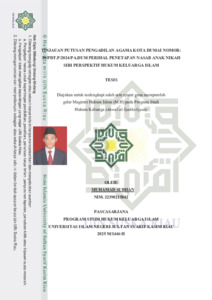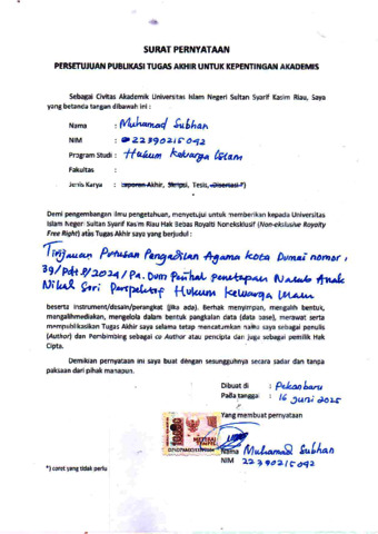 ABSTRAK Muhamad Subhan (2025) : Tinjauan Putusan Pengadilan Agama Kota Dumai Nomor : 39/Pdt.P/2024/Pa.Dum Perihal Penetapan Nasab Anak Nikah Siri Perspektif Hukum Keluarga Islam Pernikahan siri adalah pernikahan yang sah dilakukan menurut agama namun secara hukum perundang-undangan tidak sah karena tidak tercatatnya suatu perkawinan di kantor pencatatan sipil. Maka hal tersebut adalah salah satu perkara yang masuk di Pengadilan Agama Kota Dumai, Nomor: 39/Pdt.P/2024/Pa.Dum dimana dalam kasusnya pernikahan siri tersebut termasuk kedalam pernikahan fasid karena tidak terpenuhinya salah syarat atau rukun dalam pernikahan. Namun didalam putusannya hakim menetapkan bahwa anak hasil dari pernikahan siri tersebut adalah anak sah dan dinasabkan ke ayah dan ibu sebagai orang tua biologis atas anak tersebut. Demi menjaga agar tetap terpenuhinya hak seorang, karena seorang anak tidak menanggung dosa orang tua yang telah menikah sebelumnya secara siri. Jenis penelitian yang digunakan dalam penelitian ini adalah studi kepustakaan (library reserach), pendekatan penelitian yang digunakan adalah pendekatan yuridis normatif dengan sumber data yaitu sekunder dan menggunakan teknik pengumpulan data yang yaitu teknik dokumentasi. Hasil penelitian ini menunjukkan bahwa pengkabulan hakim terhadap penetapan asalusul seorang anak yang berdasarkan hukum Islam dari perkawinan nikah siri ini agar dinasabkan kepada ayah biologis disebabkan karena dalam penyelidikan kasus tersebut di tetapkan bahwa pernikahan siri tersebut adalah pernikahan fasid. Adapun dasar dalam pertimbangan penetapan putusan tersebut ialah berdasarkan pendapat Ahli Hukum Islam, Wahbah Zuhaili dalam kitabnya Fiqh al-Islam waadillatuhu jilid 10, hal. 7256. Keputusan hakim ini sejalan dengan ajaran Islam untuk memelihara dan melestarikan keturunan Hifzhu al-Nasl dan dalam penetapannya hakim menggunakan putusan MK No. 46/PUU-VIII/2010) sebagai payung hukum. Kata Kunci: Nasab Anak, Pernikahan Siri, Hukum Islam