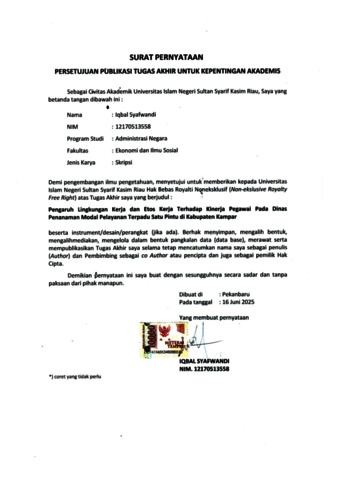 ABSTRAK Pengaruh Lingkungan Kerja dan Etos Kerja Terhadap Kinerja Pegawai Pada Dinas Penanaman Modal Pelayanan Terpadu Satu Pintu di Kabupaten Kampar Oleh Iqbal Syafwandi 12170513558 Penelitian ini bertujuan untuk mengetahui sejauh mana hubungan lingkungan kerja, etos kerja terhadap kinerja pegawai di DPMPTSP Kab. Kampar, dan untuk mengetahui bagaimana pengaruh linkungan kerja dan etos kerja terhadap pegawai. Dalam penelitian ini penulis menyebarkan kuesioner kepada 79 responden dengan metode purposive sampling. Penelitian ini bersifat deskriptif kuantitatif dengan menggunakan alat uji regresi linier berganda dan menggunakan program olahan data SPPS 22. Pada penelitian ini berdasarkan uji t yang dilakukan menunjukkan bahwa lingkungan kerja (X1) berpengaruh positif dan signifikan secara parsial terhadap kinerja pegawai (Y), serta etos kerja (X2) berpengaruh positif dan signifikan secara parsial terhadap kinerja pegawai (Y). Melalui uji F diketahui bahwa secara bersama-sama variabel independen berpengaruh terhadap variabel dependen. Hasil koefisien determinasi (R²) menunjukkan bahwa besarnya pengaruh dari variabel bebas secara bersama-sama terhadap variabel terikatnya sebesar 67,4% dan sisanya sebesar 32,6 merupakan variabel lain yang tidak diteliti dalam penelitian ini. Kata Kunci : Lingkungan Kerja dan Etos Kerja, Kinerja Pegawai dan Pengaruh