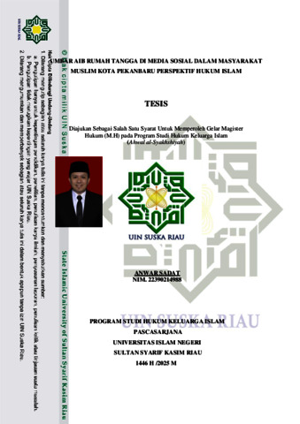 Penulisan tesis ini dilatarbelakangi oleh para pelaku umbar aib masalah keluarga di media sosial yang dapat menyebabkan keretakan dalam hubungan keluarga. Aib yang tersebar bisa menimbulkan rasa malu dan ketidaknyamanan bagi anggota keluarga lainnya. Mengumbar masalah pribadi atau pasangan secara online dapat merusak reputasi keluarga ataupun terhadap diri sendiri. Meskipun media sosial tampaknya merupakan ruang pribadi.. Hal ini memberi dampak pada keharmonisan rumah tangga. Permasalahan dalam Tesis ini yakni apa saja faktor dan dampak bagi pelaku umbar aib rumah tangga di media sosial dalam masyarakat muslim kota Pekanbaru serta mengenai bagaimana tinjauan hukum Islam tentang pelaku umbar aib rumah tangga di media sosial dalam masyarakat muslim kota Pekanbaru. Penelitian ini bertujuan untuk mengetahui faktor dan dampak serta tinjauan hukum Islam mengenai pelaku pelaku umbar aib rumah tangga di media sosial dalam masyarakat muslim kota Pekanbaru. Penelitian ini berbentuk penelitian lapangan (field research) dengan menggunakan teori deskriptif kualitatif. Berdasarkan hasil penelitian, bahwasanya faktor-faktor umbar aib rumah tangga di media sosial dalam masyarakat muslim kota Pekanbaru yakni, rendahnya kepercayaan kepada pasangan atau saling kurangnya keperayaan satu sama lain, pembelaan diri salah satu pasangan yang tidak mau saling mengalah, ingin diketahui oleh banyak orang, kekecewaan yang tak mampu diungkapkan di dunia nyata, kurangnya pemahaman keislaman dan adapun dampak bagi pelaku umbar aib di media sosial yakni, mengundang kritik dan komentar negatif, dampak pada reputasi, hilangnya kepercayaan dan menyebabkan kerusakan rumah tangga. Serta hukum Islam melarang seorang muslim untuk mengumbar aib karena hal ini bertentangan dengan fungsi pasangan suami istri yang diumpamakan sebagai pakaian, sebagaimana yang dijelaskan dalam potongan Surat Al-Baqarah ayat 187. Kemudian istri yang melakukan tindakan umbar aib pasangan di media sosial, seorang istri telah melanggar hak dan kewajibannya sekaligus bertentangan dengan tujuan perkawinan menurut maqashid syarī’ah yaitu ḥifẓ al-nafs atau ḥifẓ nasab, mengenai tujuan perkawinan ialah untuk menjaga kehormatan Kata kunci: Umbar Aib, Rumah Tangga, Media Sosial, Masyarakat Muslim, Hukum Islam. "