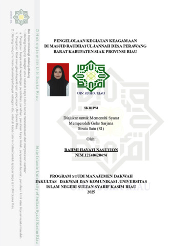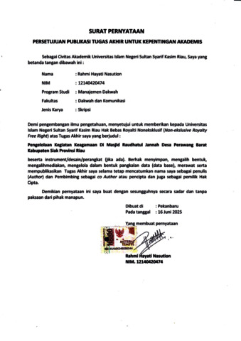Nama : Rahmi Hayati Nasution NIM : 12140420474 Judul : Pengelolaan Kegiatan Keagamaan di Masjid Raudhatul Jannah Desa Perawang Barat Kabupaten Siak Provinsi Riau Penelitian ini berfokus pada kegatan keagamaan yang di selenggarakan di Masjid Raudhatul Jannah Desa Perawang Barat Kabupaten Siak Provinsi Riau. Masjid ini rutin menyelenggarakan kegiatan kegamaan seperti kajian agama, kajian subuh, buka puasa sunnah berjamaah, wirid ibu-ibu, dan takziah. Hal tersebut sebagai upaya dalam menjadikan masjid Raudhatul Jannah menjadi pusat kegiatan keagamaan umat islam di Desa Perawang Barat. Adapun rumusan masalah dalam penelitian ini bagaimana pengelolaan kegiatan keagamaan di Masjid Raudhatul Jannah Desa Perawang Barat Kabupaten Siak Provinsi Riau. Penelitian ini bertujuan untuk mengetahui pengelolaan kegiatan keagamaan di Masjid Raudhatul Jannah Desa Perawang Barat Kbupaten Siak Provinsi Riau. Penelitian ini menggunakan metode dekskriptif kualitatif degan pengumpulan data melalui observasi, wawancara, dan dokumentasi. Informan dalam penelitian ini adalah ketua umum, Ketua Bidang Imarah, Anggota Bidang Imarah, Pembina, Jamaah yang aktif mengikuti kegiatan keagamaan. Hasil penelitian menunjukkan bahwa pengelolaan kegiatan keagamaan di masjid ini dilakukan dengan perencanaan yang matang, pengorganisasian yang terstruktur, pelaksanaan yang melibatkan jamaah secara aktif, dan pengawasan yang bertujuan untuk meningkatkan efektivitas kegiatan. Pengelolaan yang baik dapat menciptakan suasana kondusif dan meningkatkan partisipasi jamaah dalam kegiatan keagamaan di Masjid Raudhatul Jannah. Kata Kunci: Pengelolaan Kegiatan Keagamaan, Perencanaan, Pengorganisasian , Pelaksanaan, Pengawasan.