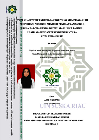 Studi Kualitatif Faktor-faktor yang Mempengaruhi Preferensi Nasabah Memilih Pembiayaan Modal Usaha Barokah pada Baitul Maal Wat Tamwil Usaha Gabungan Terpadu Nusantara Kota Pekanbaru Preferensi nasabah dalam memilih pembiayaan syariah tidak hanya dipengaruhi oleh keuntungan ekonomi, tetapi juga oleh nilai-nilai religius seperti keadilan, kehalalan, dan kemitraan. Nasabah cenderung merespons positif jika sistem pengimplementasiannya transparan dan sesuai prinsip syariah. Penelitian ini dilakukan dengan tujuan untuk menjelaskan bagaimana implementasi pembiayaan syariah dan faktor-faktor yang mempengaruhi preferensi nasabah memilih pembiayaan syariah serta preferensi nasabah dalam memilih pembiayaan berdasarkan perspektif ekonomi syariah pada Baitul Maal Wat Tamwil Usaha Gabungan Terpadu (BMT-UGT) Nusantara Kota Pekanbaru. Jenis penelitian ini merupakan penelitian lapangan dengan menggunakan pendekatan kualitatif. Sumber data dalam penelitian ini terdiri dari data primer dan skunder. Subjek penelitian adalah pengurus dan nasabah dengan objek penelitian yaitu impelementasi pembiayaan syariah dan faktor-faktor yang mempengaruhi preferensi nasabah memilih pembiayaan di BMT UGT Nusantara Kota Pekanbaru. Informan penelitiannya yaitu kepala cabang, account officer dan nasabah BMT UGT Nusantara Kota Pekanbaru dengan teknik purposive sampling. Teknik pengumpulan data dilakukan dengan observasi, wawancara dan dokumentasi yang dianalisis menggunakan teknik analisis deskriptif. Hasil penelitian didapatkan bahwa pembiayaan Modal Usaha Barokah di BMT-UGT Nusantara Kota Pekanbaru diimplementasikan dengan menggunakan akad mudharabah, musyarokah dan murabahah yang disesuaikan dengan kebutuhan anggotanya. Keuntungan dari hasil usahanya memiliki proporsi antara 50% hingga 70% bagi anggota dari keuntungannya. Nasabah diberikan kemudahan dalam pembayaran, termasuk opsi pelunasan lebih awal dengan pengurangan margin, serta adanya restrukturisasi bagi anggota yang mengalami kesulitan finansial. Faktor-faktor yang mempengaruhi preferensi nasabah memilih pembiayaan syariah di BMT-UGT Nusantara Kota Pekanbaru dipengaruhi oleh kemudahan proses pengajuan, keyakinan terhadap prinsip syariah, serta dukungan sosial dari keluarga dan teman. Perspektif Ekonomi Syariah terhadap Perilaku Nasabah BMT-UGT Nusantara Kota Pekanbaru dalam memilih pembiyaan sesuai dengan prinsip ekonomi syariah yakni dengan menggunakan prinsip saling tolong menolong dan prinsip keadilan dengan menghindari riba. Kata Kunci: Preferensi, Nasabah, Pembiayaan.