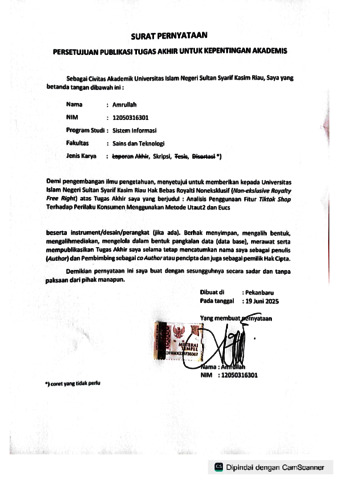 AMRULLAH, - (2025) ANALISIS PENGGUNAAN FITUR TIKTOK SHOP TERHADAP PERILAKU KONSUMEN MENGGUNAKAN METODE UTAUT2 DAN EUCS. JIPI (Jurnal Ilmiah Penelitian dan Pembelajaran Informatika), 11 (2). ISSN e-ISSN: 2540 - 8984