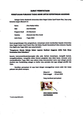 DIVA NADAA HAFIZA, - (2025) PENGUKURAN KINERJA BELANJA DALAM LAPORAN REALISASI ANGGARAN (LRA) PADA DINAS PERTANAHAN KOTA PEKANBARU. Laporan thesis, UNSPECIFIED.