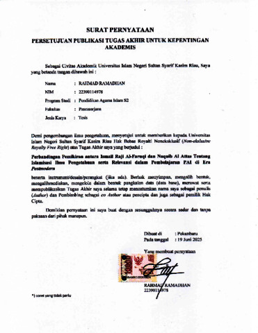pernyataan Publish - RAHMAD RAMADHAN Pendidikan Agama Islam (S2).pdf - Published Version