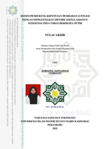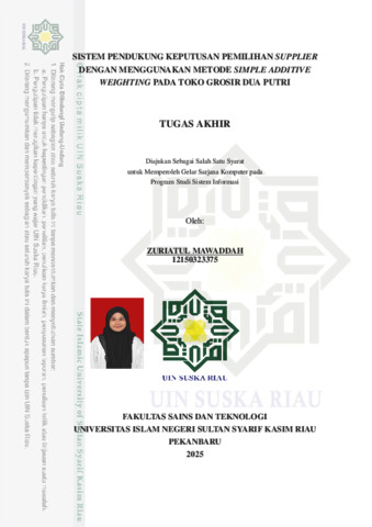 ZURIATUL MAWADDAH, - (2025) SISTEM PENDUKUNG KEPUTUSAN PEMILIHAN SUPPLIER DENGAN MENGGUNAKAN METODE SIMPLE ADDITIVE WEIGHTING PADA TOKO GROSIR DUA PUTRI. Jurnal Pendidikan dan Teknologi Indonesia, 5 (8). ISSN P-ISSN : 2775-4227 dan E-ISSN : 2775-4219