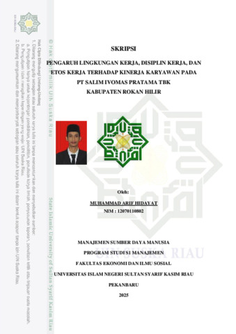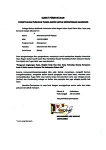 ABSTRAK PENGARUH LINGKUNGAN KERJA, DISIPLIN KERJA, DAN ETOS KERJA TERHADAP KINERJA KARYAWAN PADA PT. SALIM IVOMAS PRATAMA TBK KABUPATEN ROKAN HILIR. Oleh: Muhammad Arif Hidayat NIM. 12070110802 PT. Salim Ivomas Pratama Tbk merupakan salah satu perusahaan di bidang industri perkebunan dan pengolahan kelapa sawit. Penelitian ini bertujuan untuk menganalisis pengaruh lingkungan kerja, disiplin kerja, dan etos kerja terhadap kinerja karyawan pada PT. Salim Ivomas Pratama Tbk yang berlokasi di Kabupaten Rokan Hilir. Masalah kinerja karyawan menjadi perhatian serius karena berpengaruh terhadap produktivitas dan pencapaian target perusahaan. Lingkungan kerja yang kondusif, disiplin kerja yang konsisten, serta etos kerja yang tinggi diyakini dapat meningkatkan kinerja karyawan. Penelitian ini menggunakan pendekatan kuantitatif dengan metode survei. Data dikumpulkan melalui kuesioner yang disebarkan kepada 60 responden, yaitu karyawan bagian administrasi, dan dianalisis menggunakan metode regresi linier berganda dengan bantuan aplikasi SPSS. Teknik pengambilan sampel menggunakan total sampling. Hasil penelitian menunjukkan bahwa lingkungan kerja, disiplin kerja, dan etos kerja berpengaruh positif dan signifikan terhadap kinerja karyawan. Lingkungan kerja yang mendukung serta kedisiplinan dan etos kerja yang tinggi terbukti mampu mendorong peningkatan kinerja. Implikasi dari penelitian ini adalah pentingnya perusahaan memperhatikan ketiga aspek tersebut dalam rangka meningkatkan produktivitas dan pencapaian tujuan organisasi. Kata Kunci: Lingkungan Kerja, Disiplin Kerja, Etos Kerja, Kinerja Karyawan