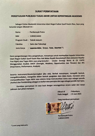 PARDIANSYAH PUTRA (2025) USULAN STRATEGI BISNIS DI CK COFFE MENGGUNAKAN ANALISIS SWOT (STRENGTH, WEAKNESS ,OPPORTUNITIES DAN THREATS) DAN IPA (IMPORTANCE PERFORMANCE ANALYSIS). Skripsi thesis, Universitas Islam Negeri Sultan Syarif Kasim Riau.