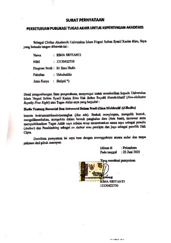 RIMA SRIYANTI, - (2025) HADIS TENTANG BERSOSIAL DAN INTROVERSI DALAM STUDI (ILMU MUKHTALIF AL-HADITS). Skripsi thesis, UNIVERSITAS ISLAM NEGERI SULTAN SYARIF KASIM RIAU.